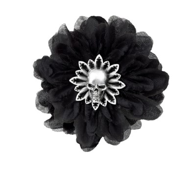 An urbane reminder of the bizarrely gruesome, unsolved murder of 1947 California; black fabric flower with pewter skull centrepiece. (Flowers are individually made and therefore may vary from one illustrated). Matching choker see P674.