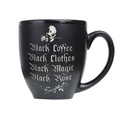 A substantial, high quality drinking mug baring poetic homage to all things black. 'Black coffee, black clothes, black magic, black rose'!