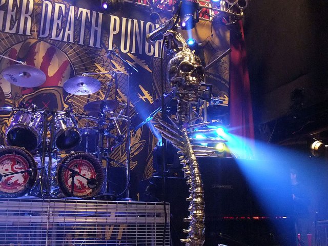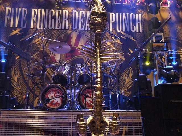 The microphone stand created by The Alchemy Studios for the metal band Five Finger Death Punch on stage.